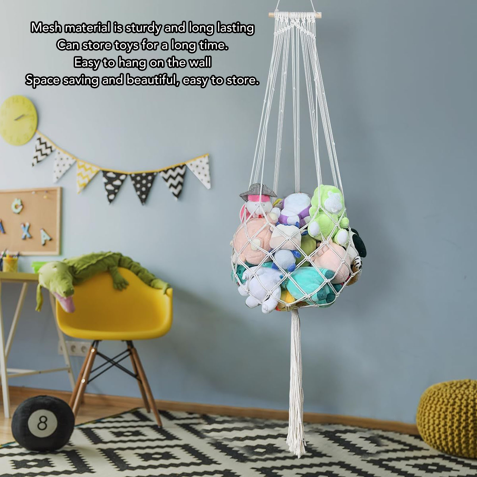 Stuffed Animal Net Wall Hanging Storage Net Bohemian Style Plush Toy Display Holder Toy Organizer with Wooden Stick for Bedroom Decoration
