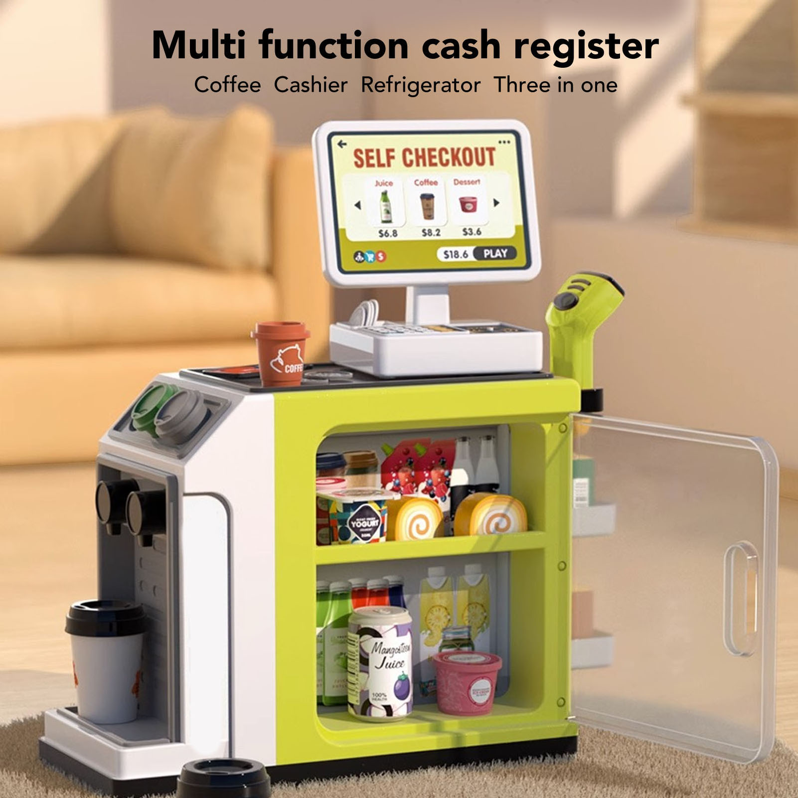 Pretend Supermarket Cashier Register Toy with Realistic Coffee Machine Refrigerator Scanner Play Cash Register for Boys Girls