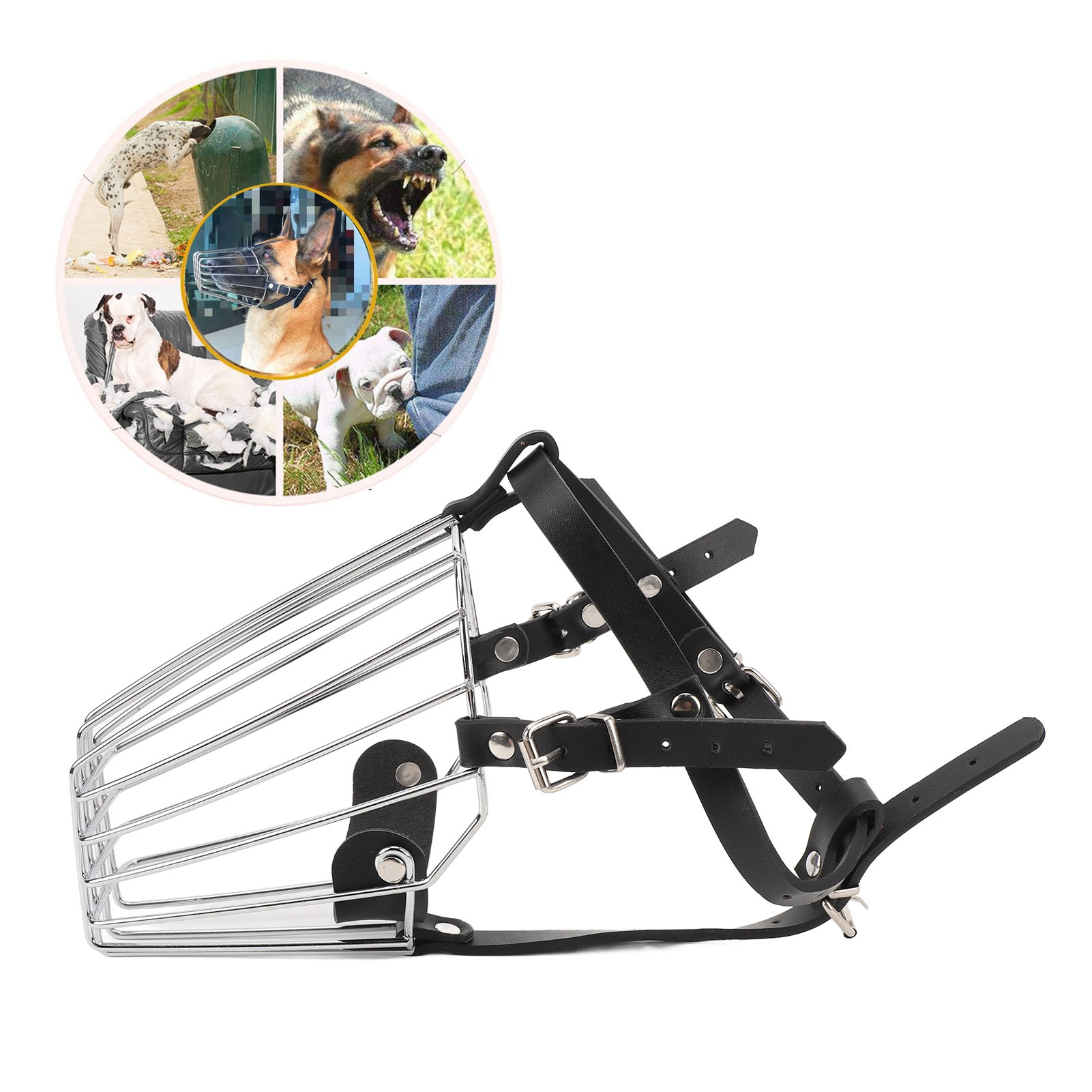 Dog Muzzle Stainless Steel Basket Leather Strap Breathable Prevent Biting Adjustable Muzzle for Medium Large Sized Dog