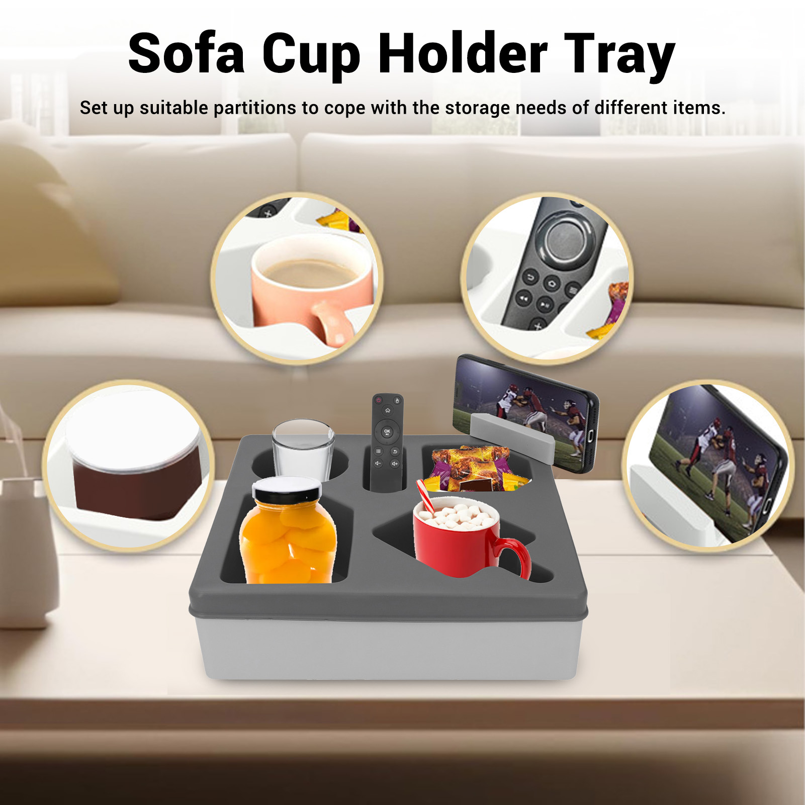 Sofa Cup Holder Tray with Phone Stand Silicone Plastic Couch Caddy Drink Holder for Bed Car Remote Control Snacks and Other Items Grey