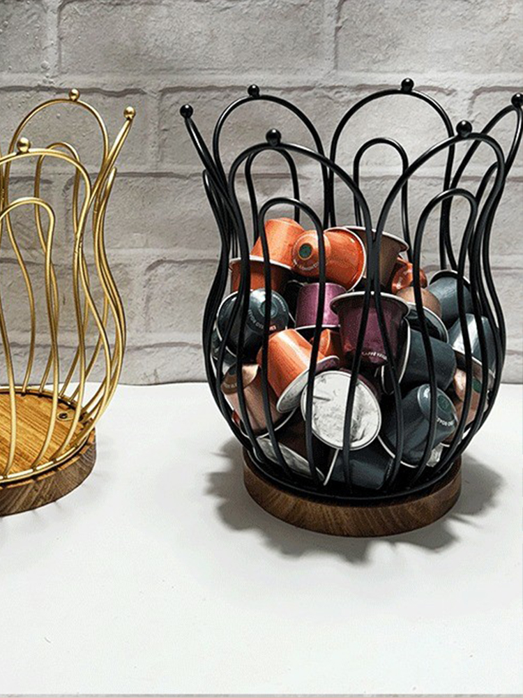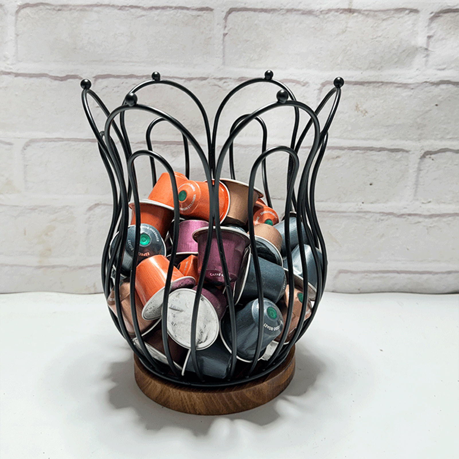 Tall Black Flower Bag Style Metal and Wood Storage Tray for Nuts and Coffee Capsules Creative Decorative Organizer for Home and Party Use