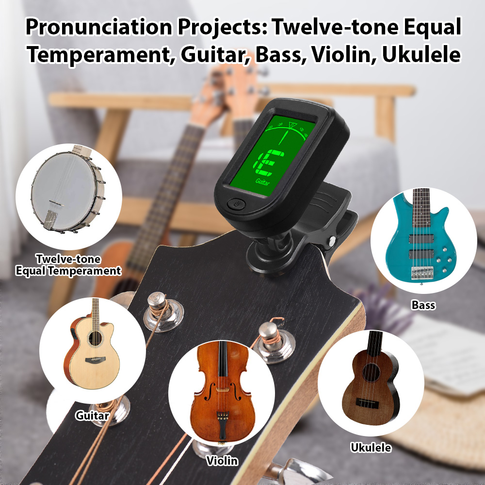 Clip auf elektronischem Tuner mit zweifarbiger Hintergrundbeleuchtung LED-Bildschirm, E-Holz-Gitarre Bass Ukulele Universal-Clip auf elektronischem Tuner T02Li, reguläre wiederaufladbare Version, geliefert mit Knopfbatterie