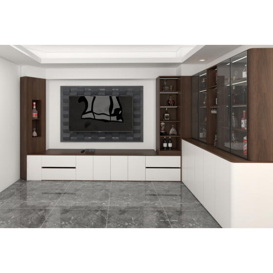 Moderne TV-Kombination & Schminktisch, 2 Optionen: Große Vitrine mit Beleuchtung oder Kommode mit Spiegel, Wandmontiert, Für Wohnzimmer & Schlafzimmer, Individuelle Konfiguration