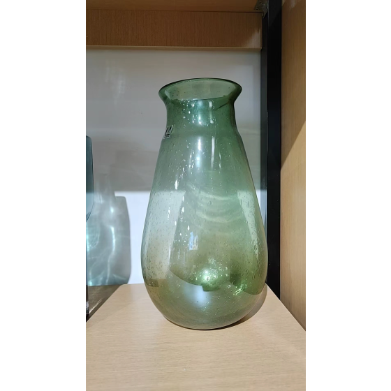 Glasgrüne Tropfenvase mit Naturbläschen Ø12,0cm/9,0cm H36cm - Handgeblasene Wanddekoration für Erkerfenster | Atmosphärisches Lichtspiel im Bauhaus-Loft | Einzelvase mit 1,5cm Wandstärke für natürliche Raumgestaltung