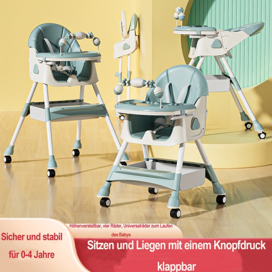 CE-Kinderhochstuhl EN 14988:2017/A2:2024: 6-fach verstellbare Rückenlehne, 7-stufige Höhe & 5-Wege-Tisch | PU-Sitz, 5-Punkt-Gurt + Feststellbremse | Klappbar für kleine Küchen | Inkl. Doppeltisch & Korb | Beige/Grau/Weiß (520x790x1010mm)