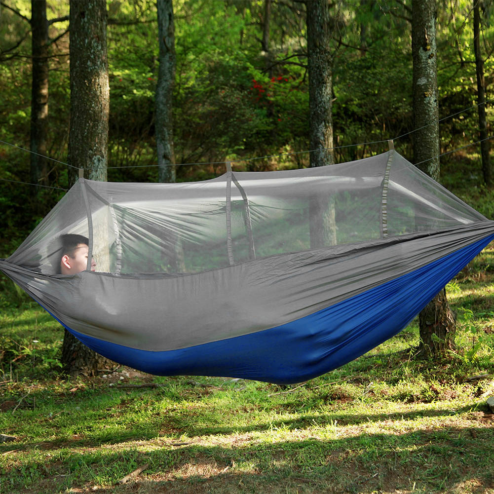 Familienfreizeitcamping, Mückenschutz, Moskitonetz, Schaukel, Hängestuhl, Hängematte (grau und blau)