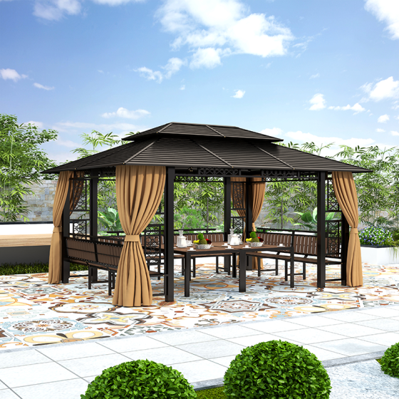Gartenpavillon Komplettset 4x3m|Alu-Stahl Rahmen + Möbel|Wahl-Dach: 0,4mm Stahlblech/0,6mm Polycarbonat|Doppeldach Design mit 30x30mm Sitzprofil - Schwarzes Metall