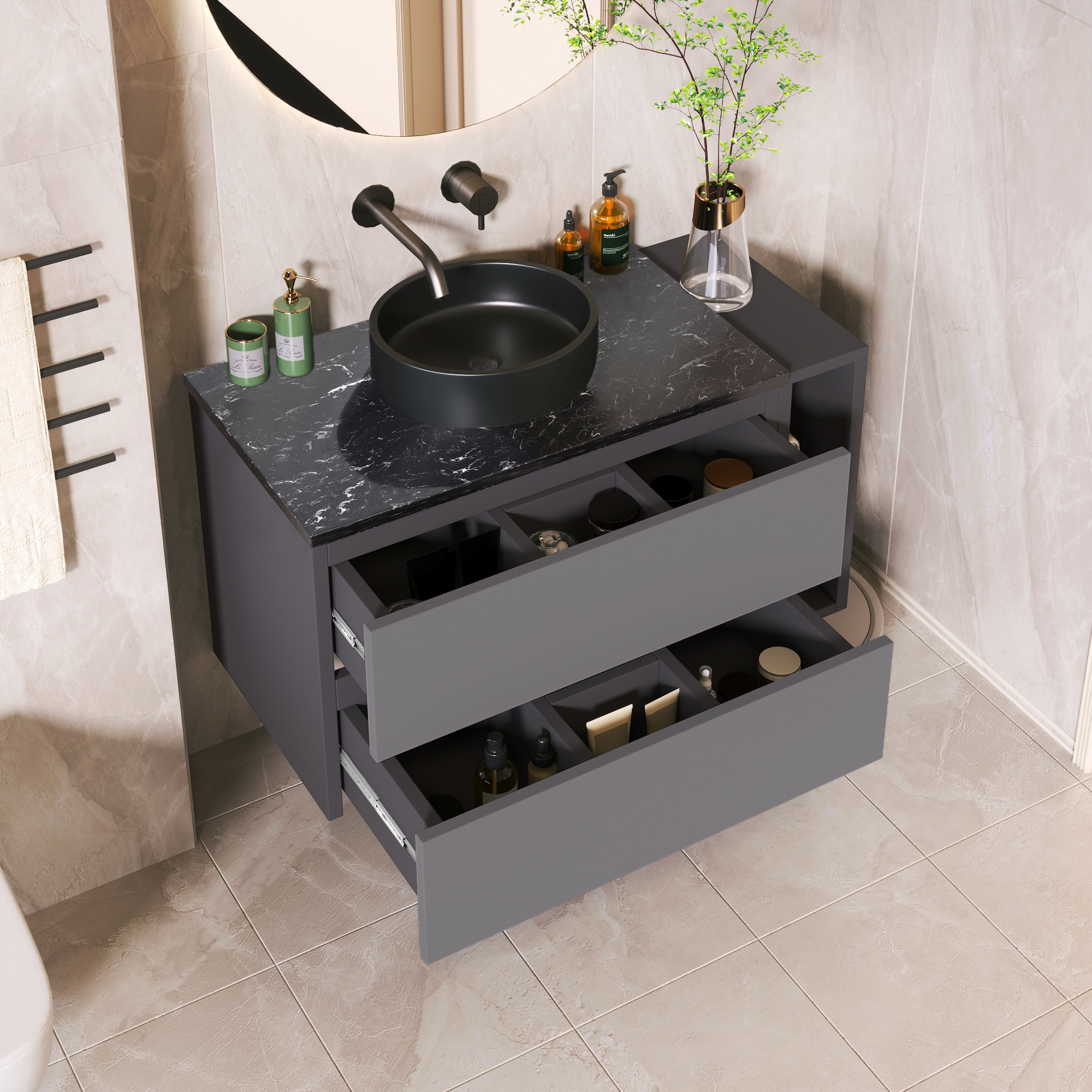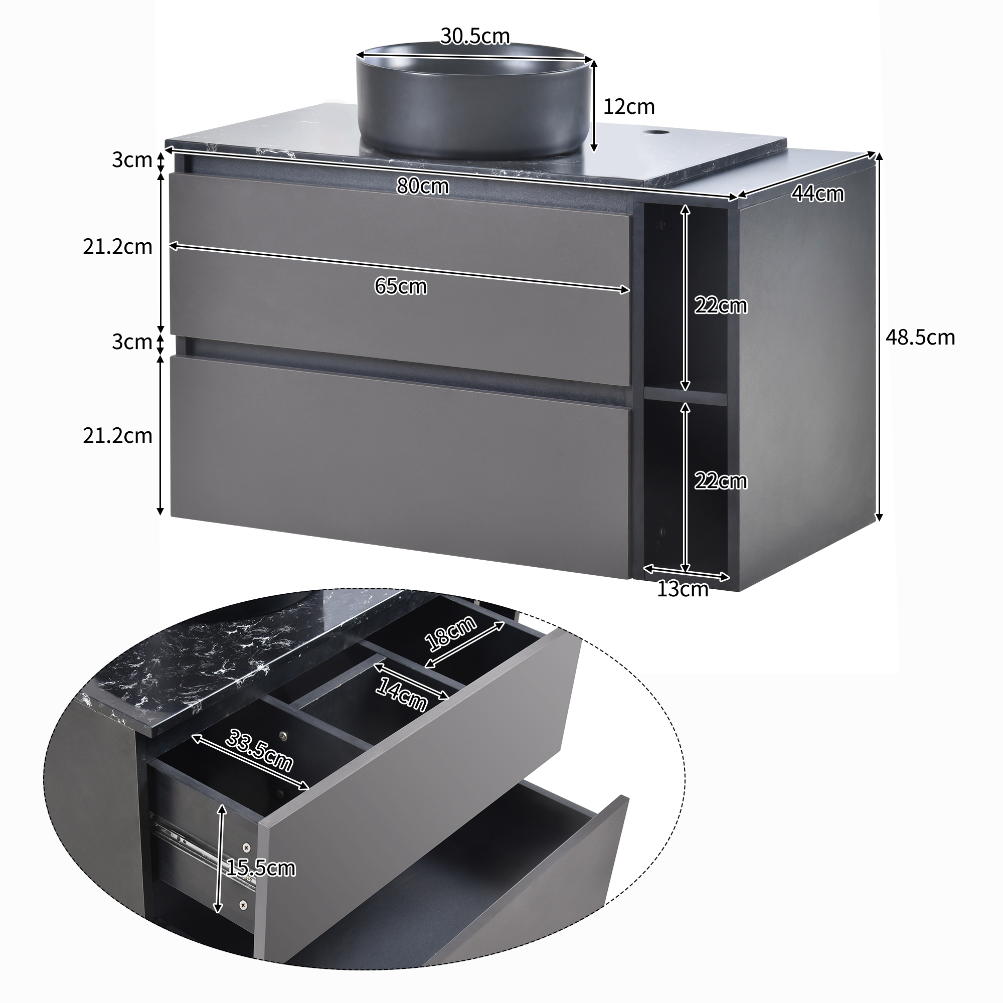 80cm Hänge Waschtischunterschrank mit Keramik Waschbecken, Schwarz Grau, MDF mit Marmor Arbeitsplatte, Schubladen, Modernes Design, Einfache Montage, Badezimmer Aufbewahrung