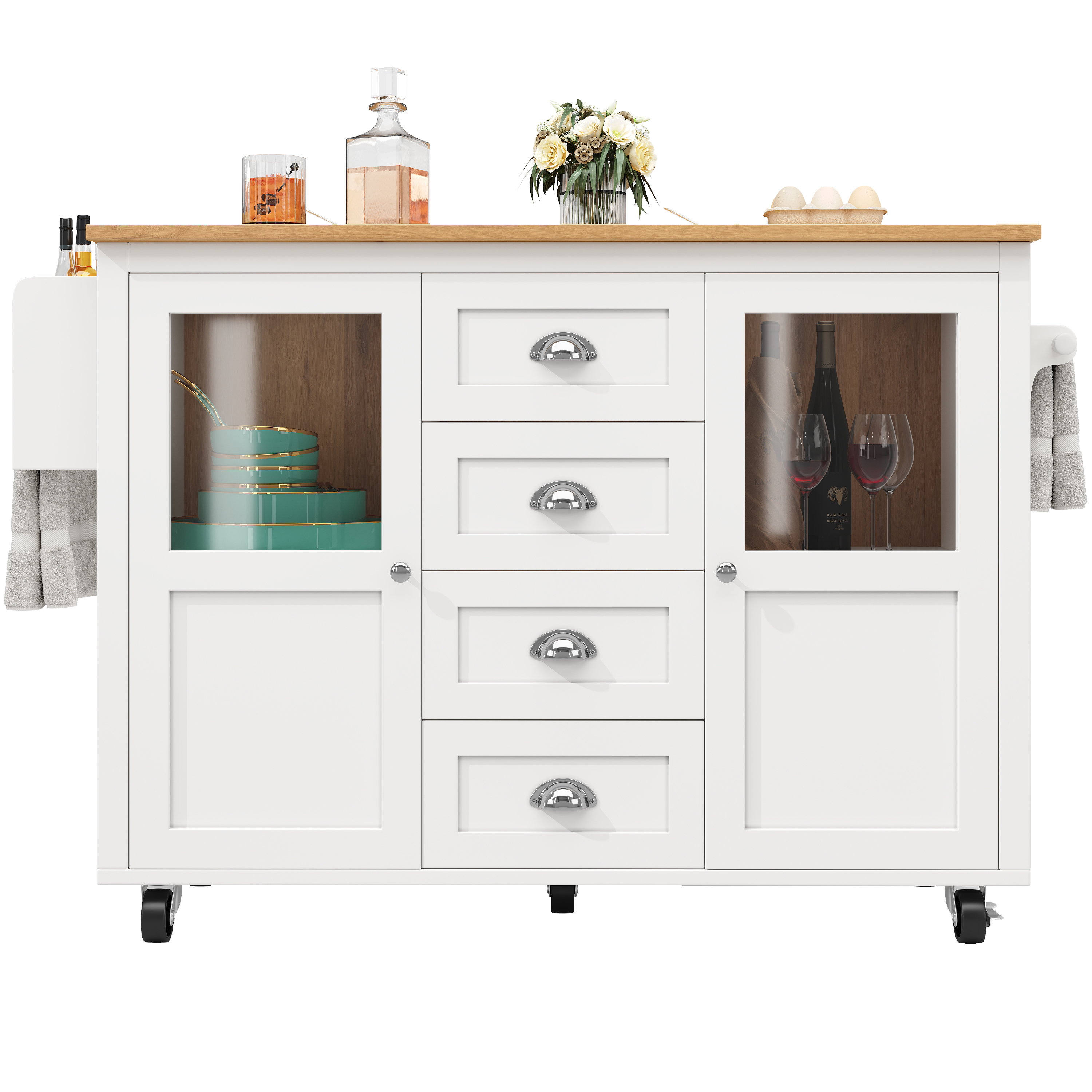 Kitchen Island on Wheels with Drop Leaf, Kitchen Cart, Buffet Cabinet, 4 Drawers & 2 Doors, Storage Cabinet with Towel Holder, Spice Rack, Adjustable Shelves, White, 120x73x93cm