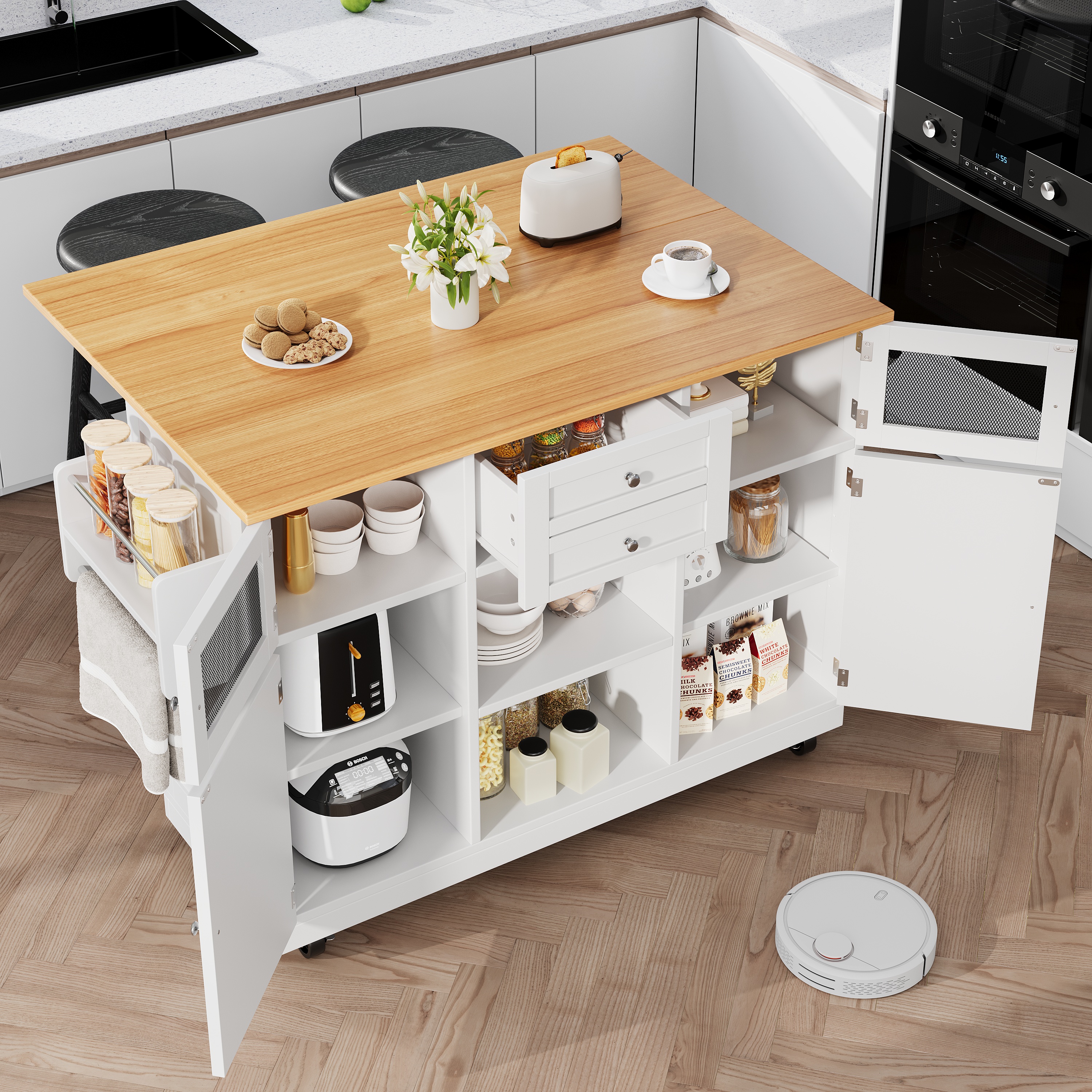 Kitchen Island with Drop-Leaf Extension & 3D Cabinet Doors, Expandable Dining Table, Kitchen Cart with Wheels, Sideboard Buffet, Towel Holder, Adjustable Shelves, White, 140x40(70)x93.5cm