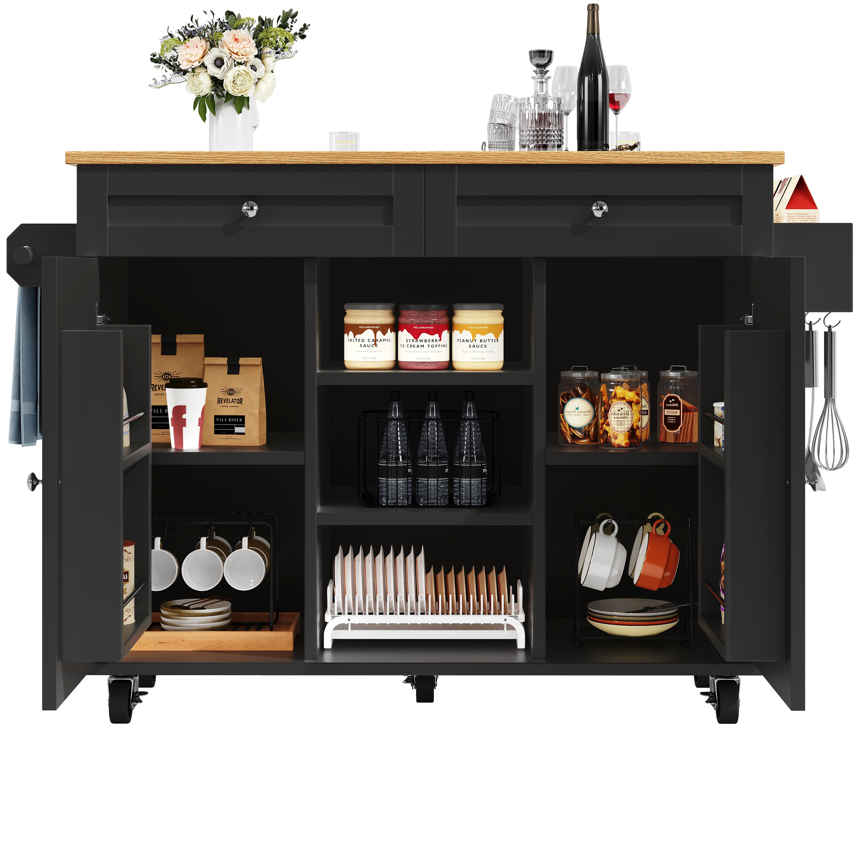 Dual-Mode Kitchen Island with 2 Locking & 3 Swivel Casters, Sideboard with 3D Doors & Snack Shelf, Mobile Kitchen Cart, Black, Countertop with Wood Grain, Adjustable Shelves