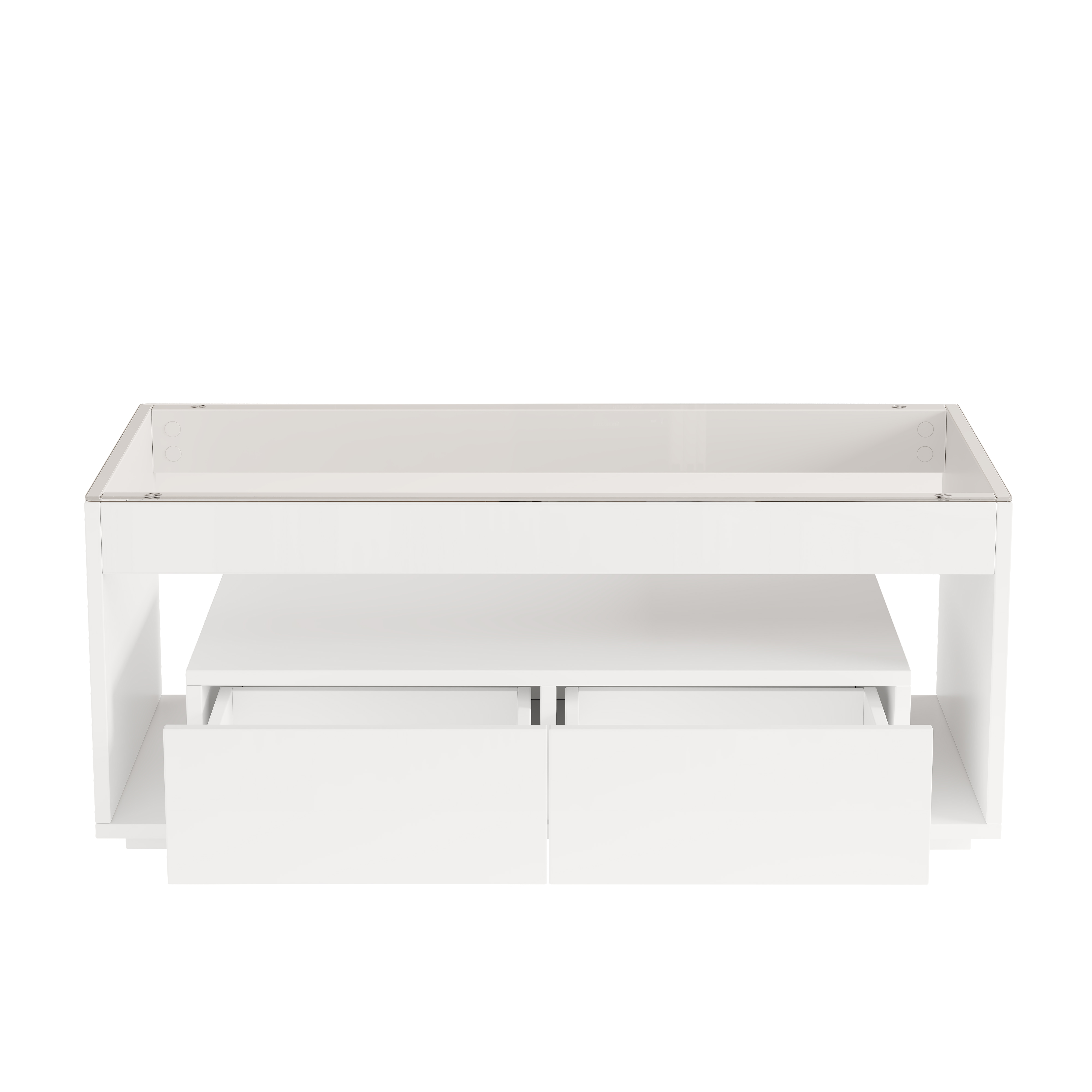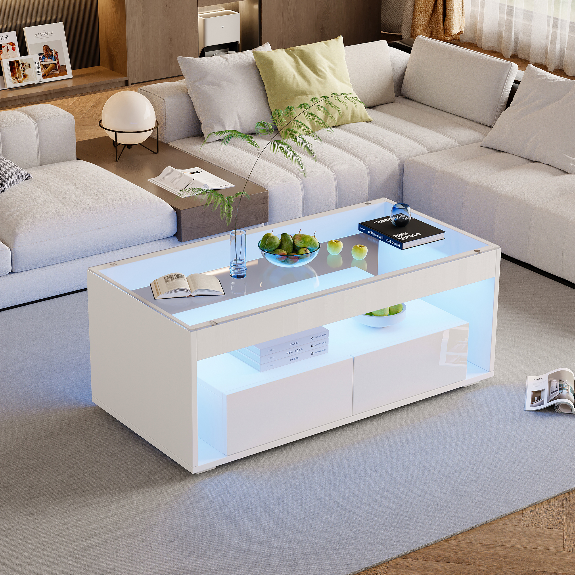 Modern LED Coffee Table with App Control, 2 Large Drawers & Tempered Glass Top, 100x50x40cm White Sofa Table with Storage, High-Gloss for Living Room