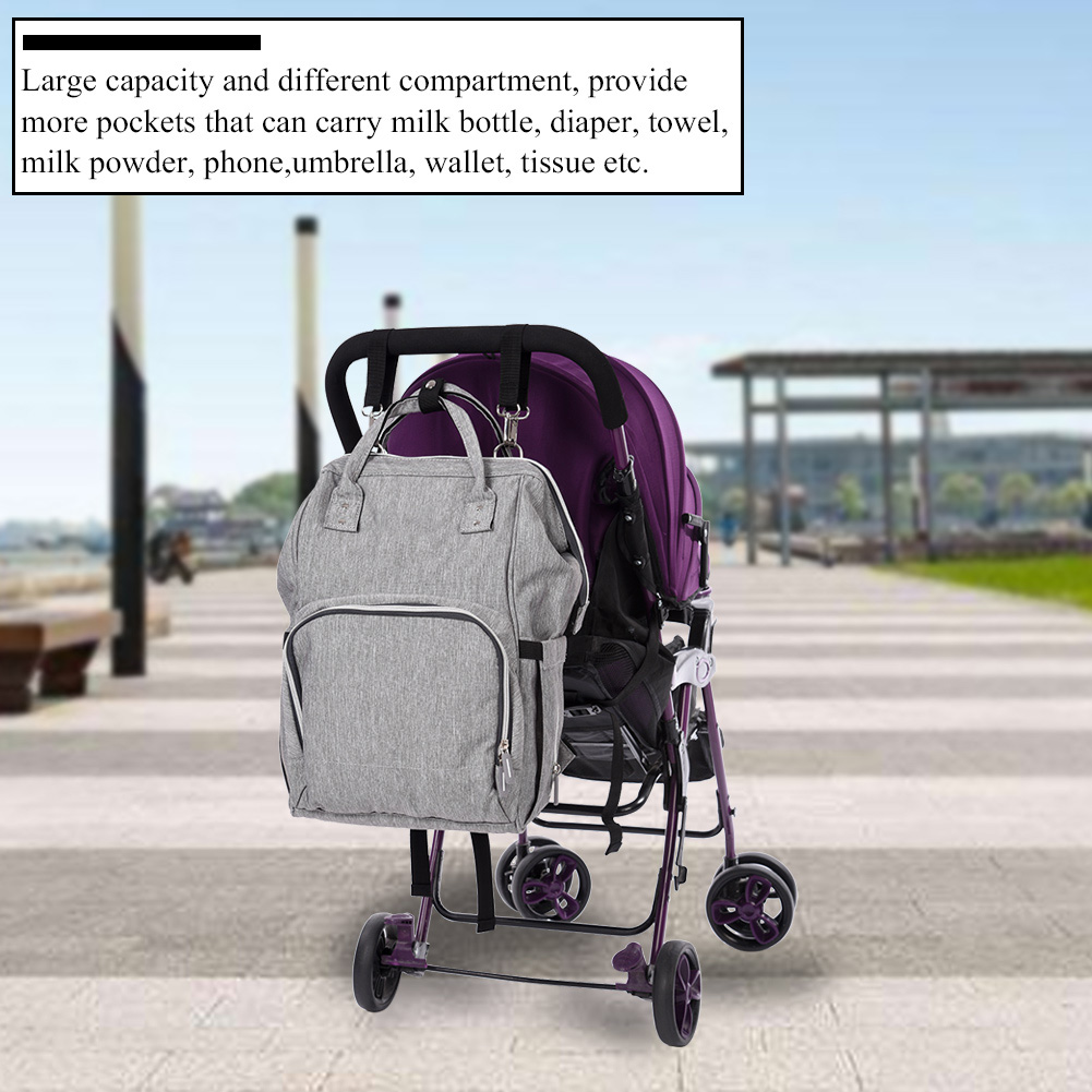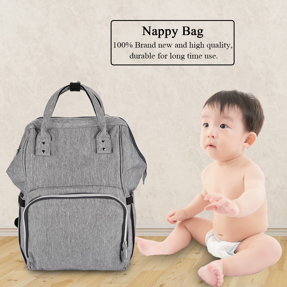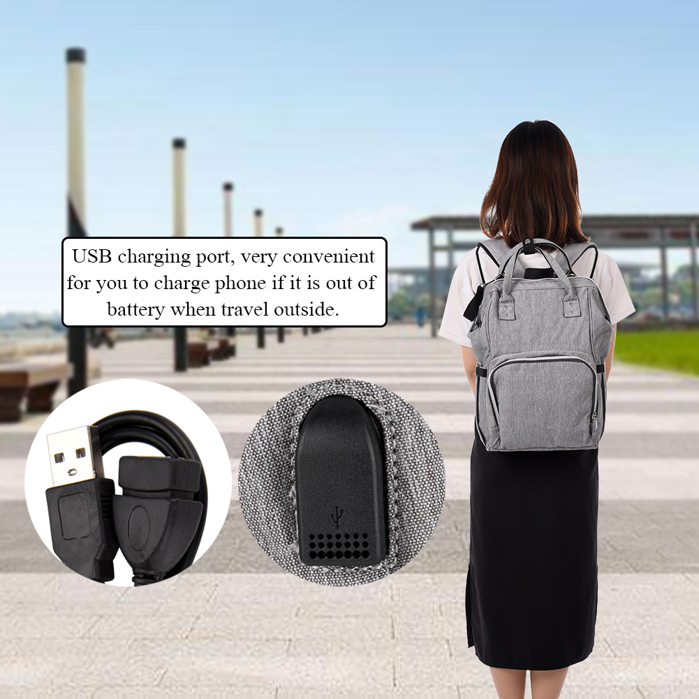 This gray large-capacity diaper backpack is the ultimate on-the-go companion for modern parents. Crafted from high-quality polyester, it is waterproof, odorless, and resistant to both high and low temperatures, ensuring long-lasting durability. Featuring a thoughtfully organized interior with ample space for all baby essentials like bottles, diapers, and formula. The innovative external USB charging port allows you to conveniently charge your phone while on the move. Multiple carrying options (backpack, handle, stroller straps) offer maximum convenience for shopping, traveling, or daily walks.