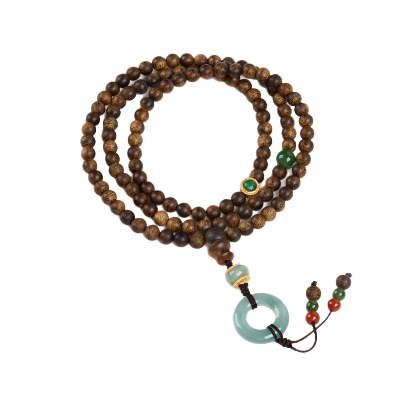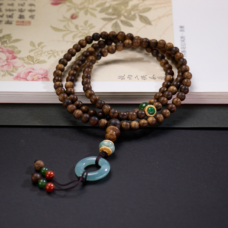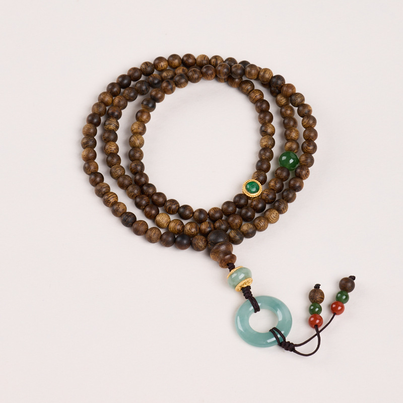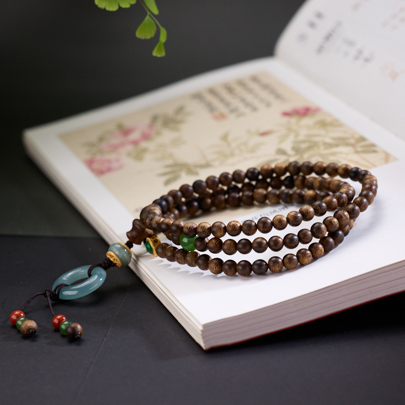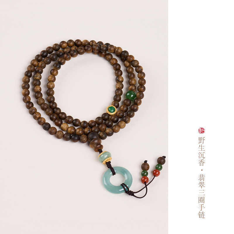 Wild Agarwood 3-Strand Bracelet, 4mm Beads with Jadeite 'Pi' Disc & Green Jade Beads, S925 Silver Accent, Handmade Buddhist Mala, Wrist Size 14-16cm