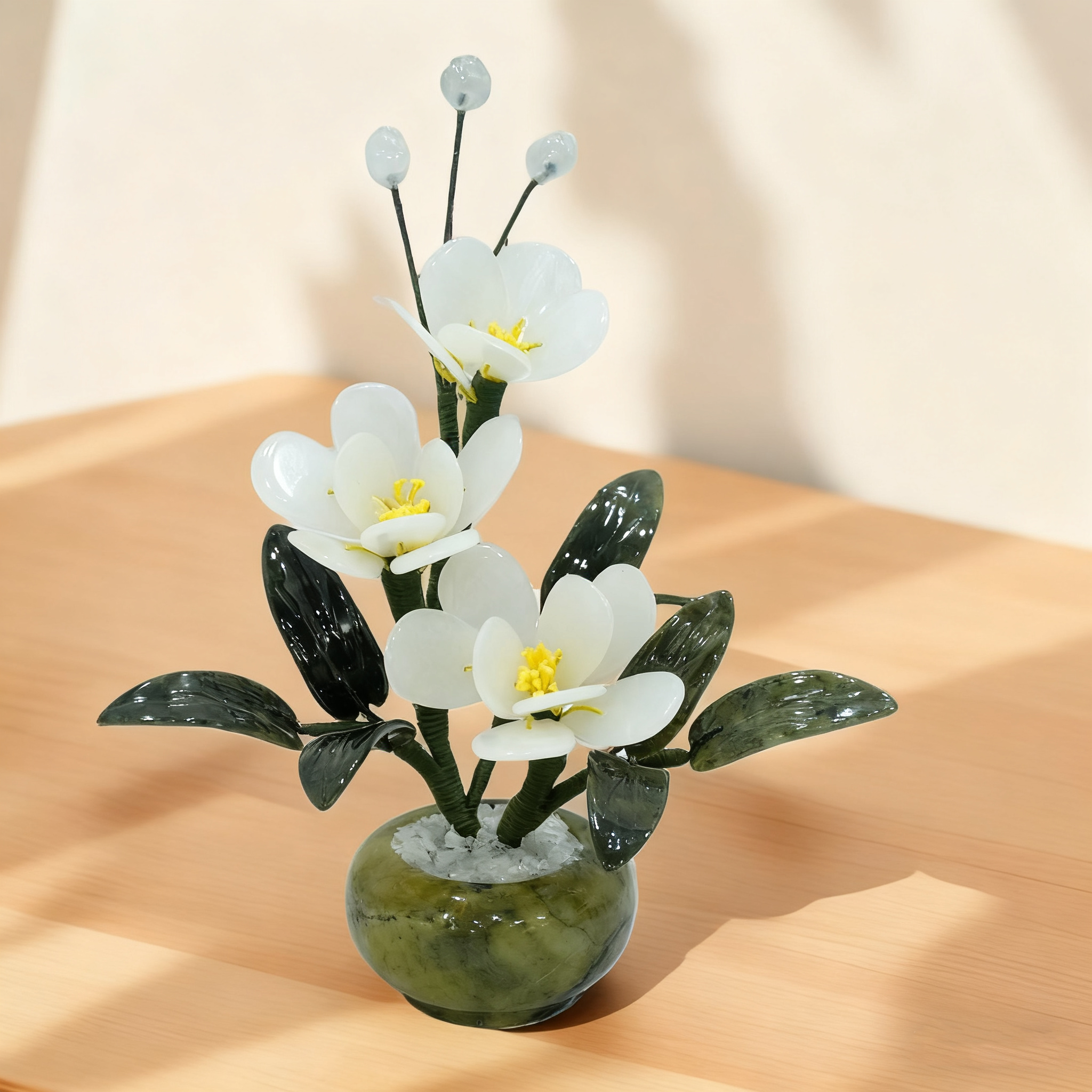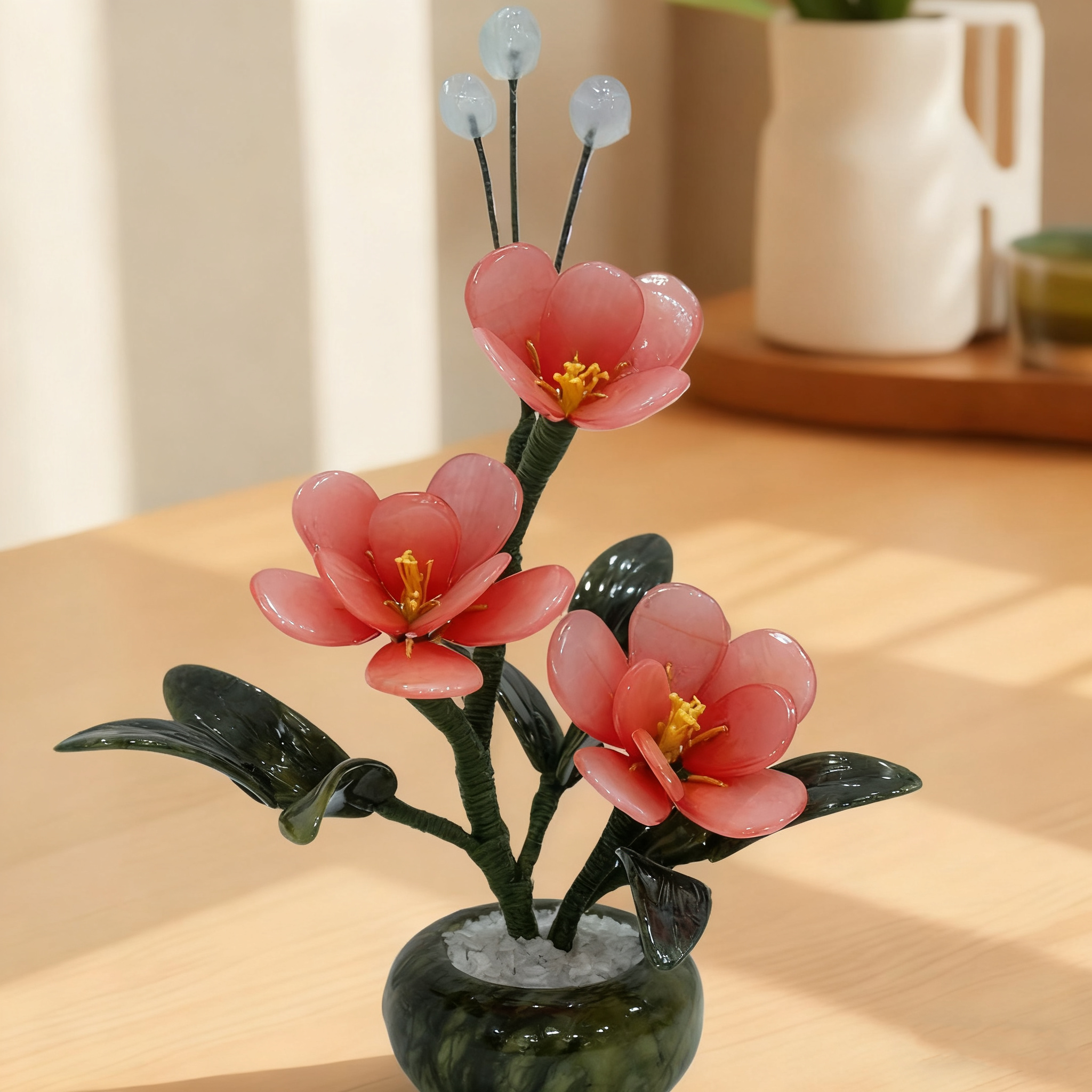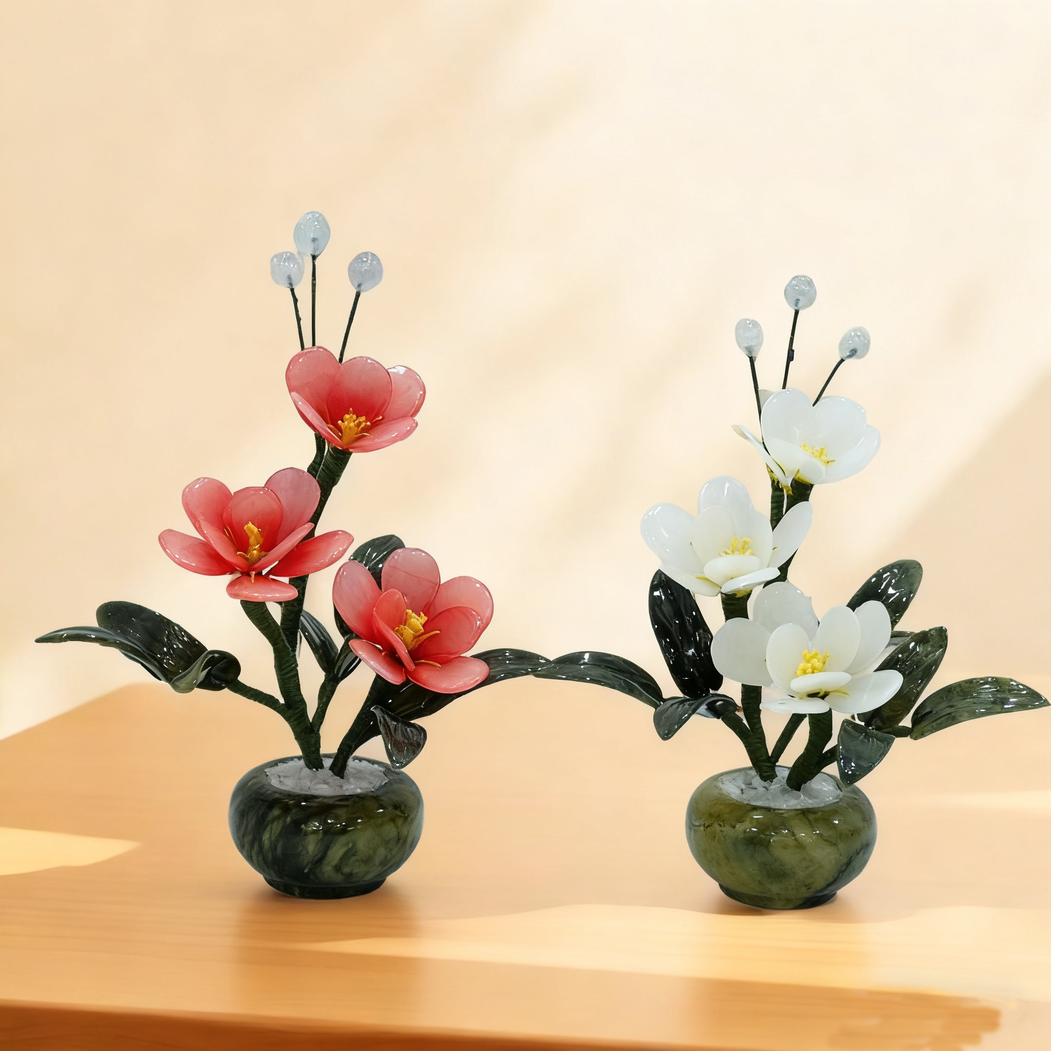 Natural Jade Flower Sculpture, Hand-Carved Orchid Potted Plant, White/Red Blooms, Asian Home Decor, Lucky Symbol Gift for Living Room & Study