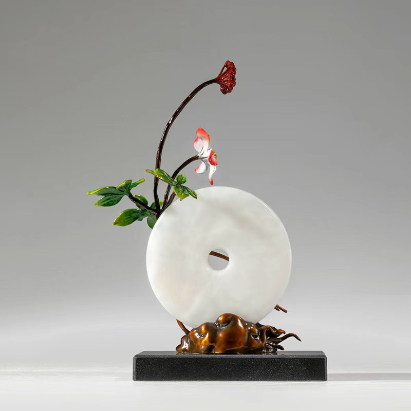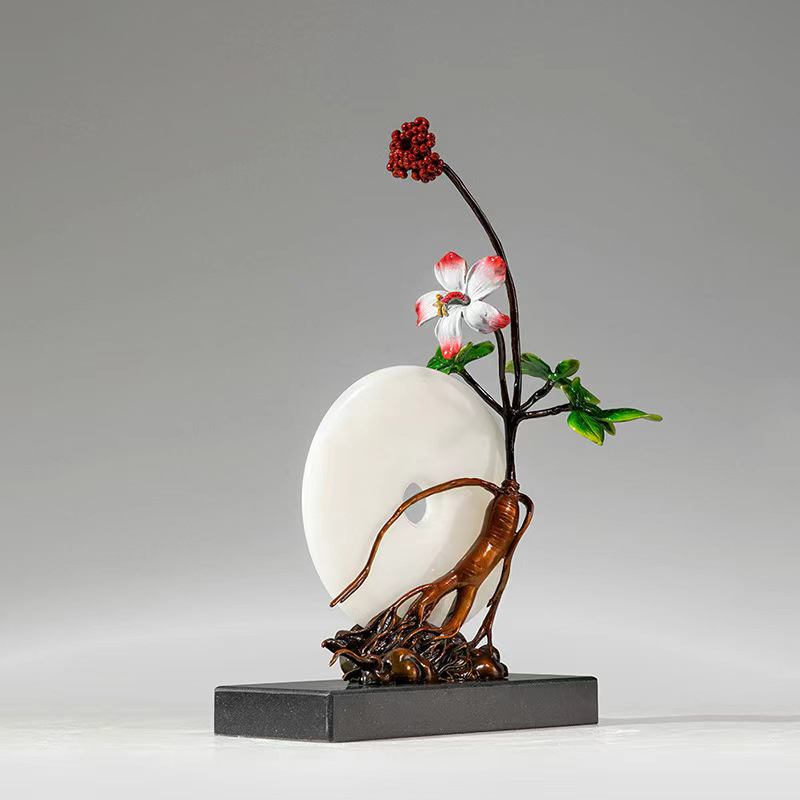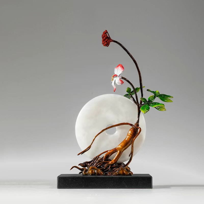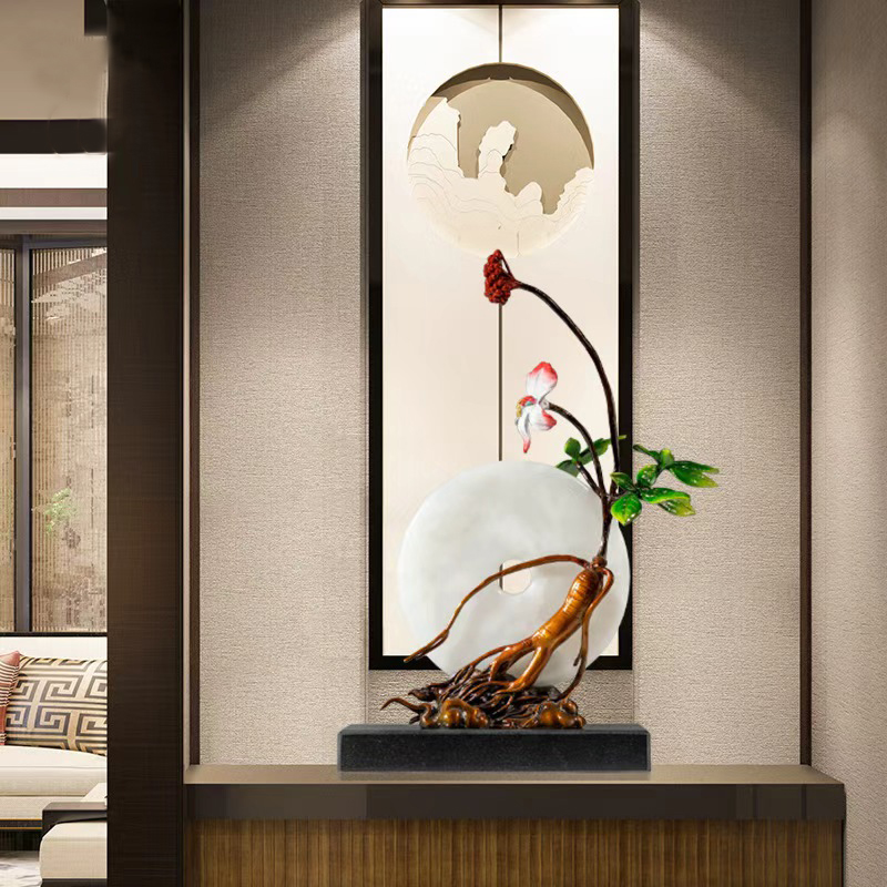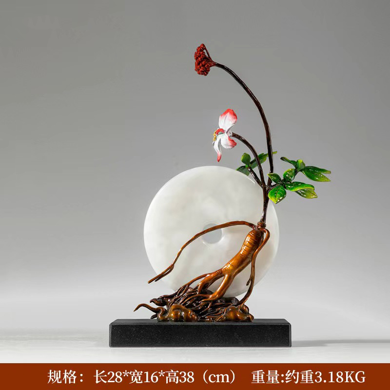 Fulfilling Life Ginseng Ornament, Jade & Brass Craft, Chinese Display Shelf Decor, Home & Show Flat Feng Shui Art (38cm)