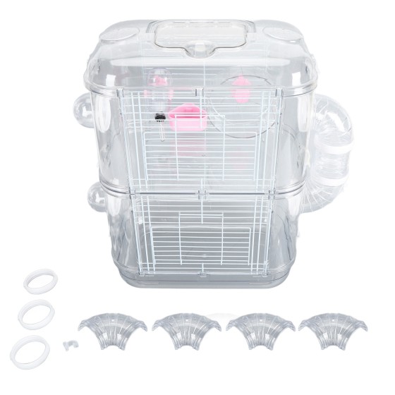 Transparent Hamster Cage 2-Tier with Tubes & Metal Mesh - 31x26x42cm Portable Small Pet Habitat for Dwarf Hamsters, Easy View + Carry Handle