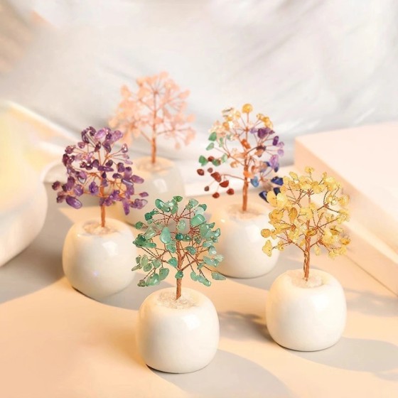 Single Crystal Money Tree Ornament w/ Citrine & Amethyst - 130mm Hand-Wired Gemstone Tree on White Ceramic Base (Ø60mm) - Desk Feng Shui for Wealth & Positivity (5 Color Options)