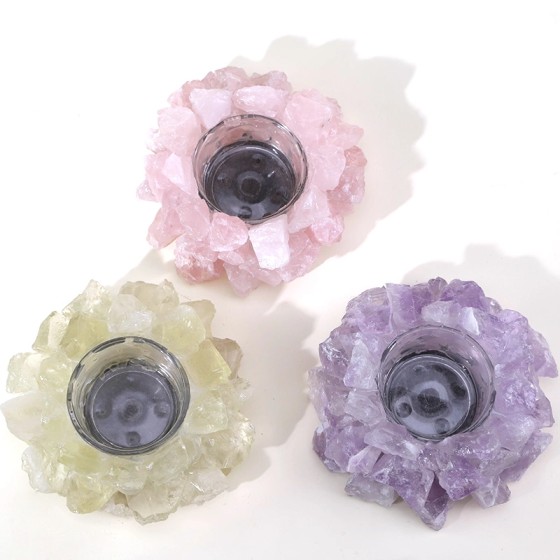 ✨ Natürlicher Rohkristall-Teelichthalter Handarbeit:Grüner/Rosa/Violetter Quarz um Glasvase - Deko für Entspannung/Fensterbank - Skandinavisch Wohnaccessoire (9cm Ø) Geschenkidee mit Naturlook
