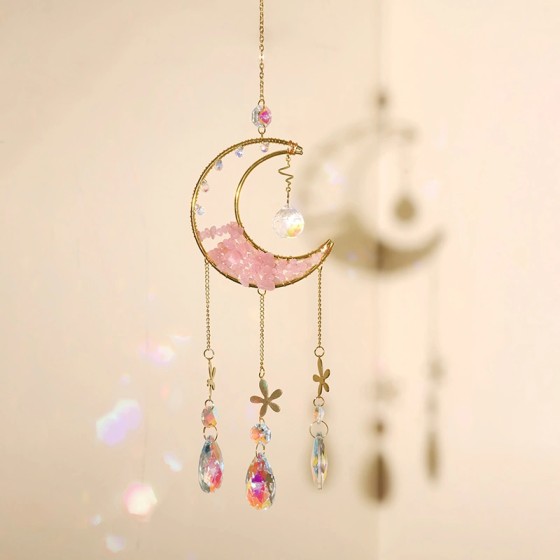 ✨【Lunar Dream】46cm Pink Crystal & 52cm Clear Moon Wall Hanger | Metal Frame with Gemstone Pendants | Bohemian Room Decor for Bedroom/Windows | Handcrafted Details