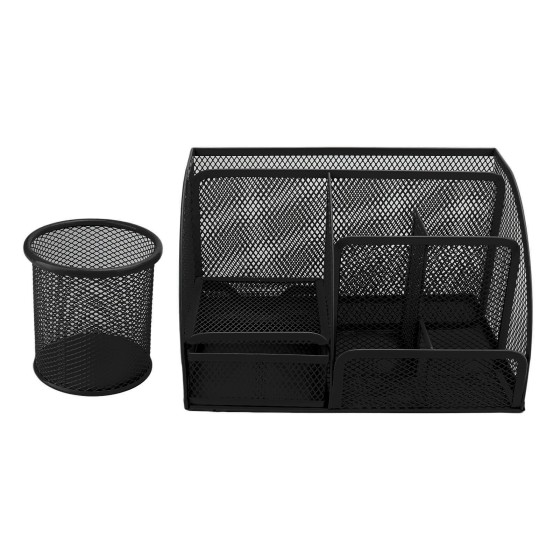 Metal Desk Organizer with Drawer, 7-Compartment Mesh Pen Holder & Round Caddy, Multipurpose Office School Supply Storage for Pens, Makeup Brushes - Black, Scratch-Resistant