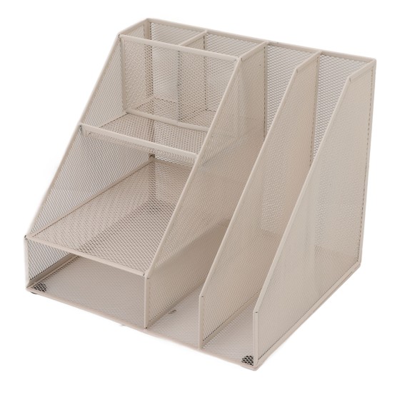 Upgraded White Metal Desk Organizer, 3-Tier 2-Compartment Mesh File Holder for A4 Paper, Letters, Books with Pen Holders, Sturdy Steel Space-Saving Office Storage Shelf