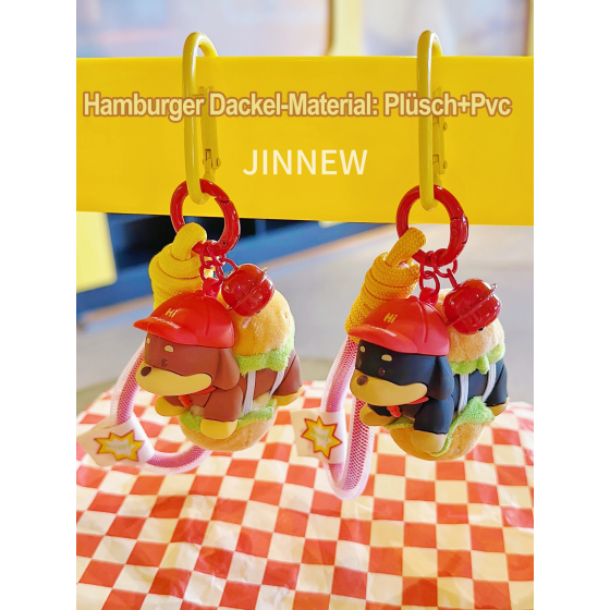 Adorable Dachshund Keychain Bag Charm (Brown/Black) - Cute Cartoon Dog in Red Hat Lounging on a Burger! Bright Yellow Strap & Red Clip, Vibrant & Playful, Perfect Everyday Gift, 4 Inch / 10cm