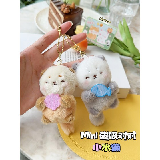 2 Pack Mini Magnetic Otter Plush Keychain Charms: Brown & Grey Otters Hug Pink Shell & Blue Fish, Cute Adorable, Magnets Connect, Gift for Best Friends Couples, 4 Inch, Linked by Gold Chain