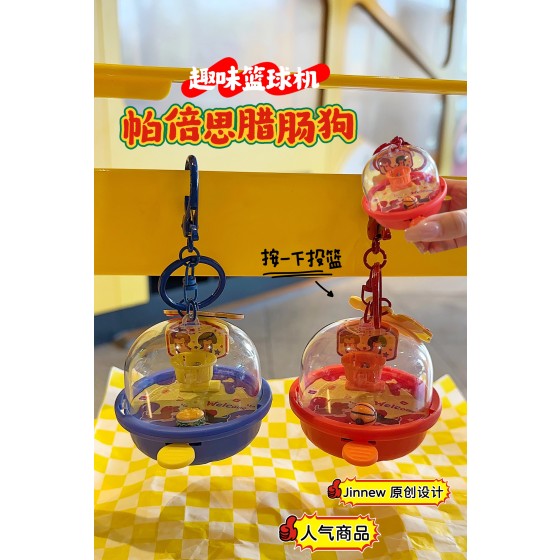 Dachshund Basketball Toy Keychain (Blue/Red) - Press-to-Shoot Mini Hoop w/ 4" PVC Dog | Interactive Bag Charm for Keys & Fun