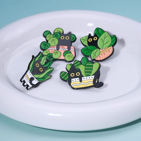 4 Pcs Cat Pot Plant Brooches Set - Adorable Black Cats in Potted Plants (2.8-3.3cm) - Mini Succulent Leaf Design for Office Wear, Gift to Plant Lovers