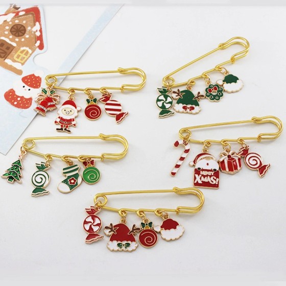 Christmas Brooches Single Piece - Five Unique Designs: Bells, Santa, Candy, Reindeer Antlers, Tree Charms - Zinc Alloy Sparkling Finish (Red, Gold, Green) - Approx 40-48x65mm - For Holiday Outfits, Hats, Scarves, Gift Wrapping Decor