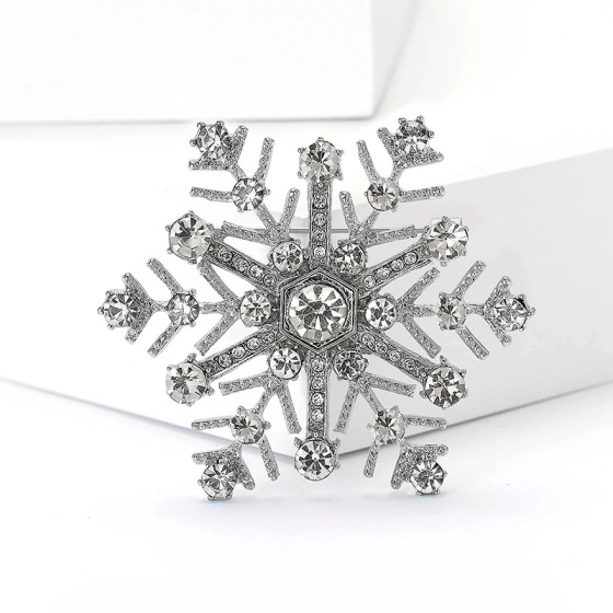 Snowflake Brooch Pin with Sparkling Rhinestones (4.5cm) - Crystal Vintage Brooch for Winter Fashion, Dresses & Bags - Shiny Metal Jewelry Gift for Festive Season & Formal Attire