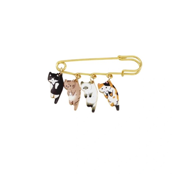 Cute Cat Brooch Pin: 4 Hanging Kitten Charms with Realistic Fur Colors + Gold Base - Mini Animal Fashion Accessories for Clothes/Bags (65x46mm) - Adorable Gift for Cat Lovers