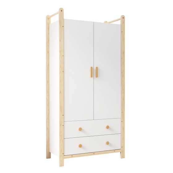 Kids Wardrobe with Clothes Rail & 2 Drawers, 90x45x180cm Pine Wood Frame White Storage Cabinet for Children's Room, Freestanding Tall Closet Organizer with Hanging Space