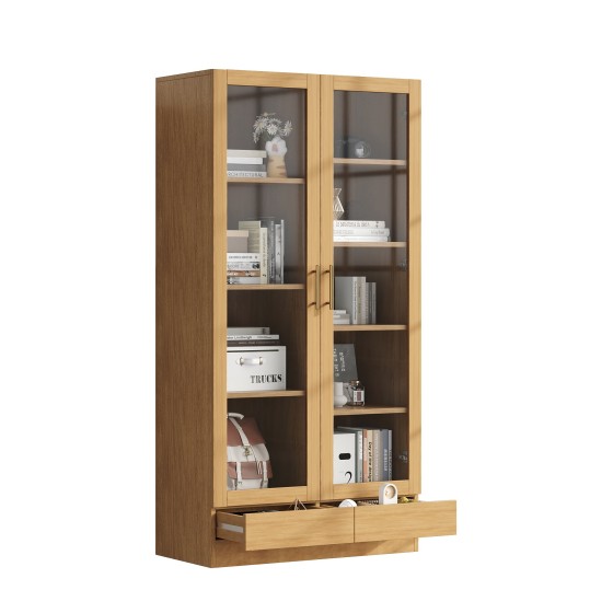 Glass Door Cabinet with Drawers, 160cm Bookcase with Push Open Drawer & Anti-Tip Device, Staggered Shelves Storage Display Case, for Living Room Office, Natural Wood