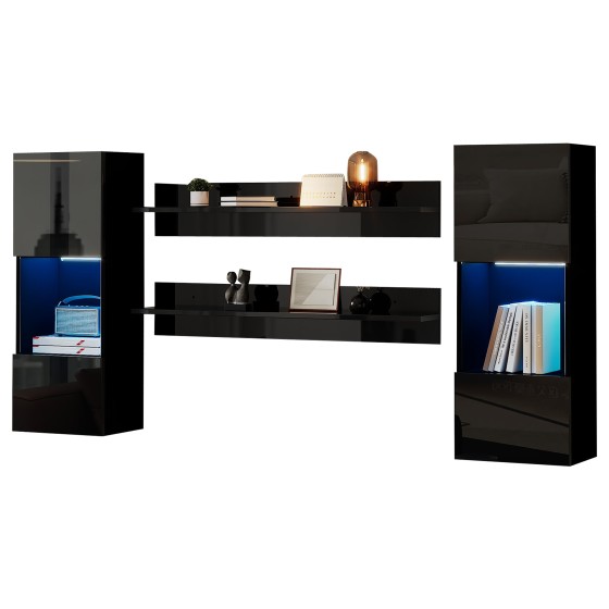 4-Pieces Floating Wall Shelf with APP Controlled LED Lights, Modern High-Gloss Glass TV Stand Cabinet Set for Living Room, Smart Storage Organizer, Black