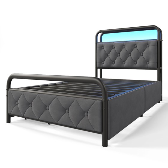 CE认证智能软包床架 | USB/Type-C充电+APP控制RGB灯效 | 灰色储物床框含2抽屉 | 不含床垫 90/140×200cm可选